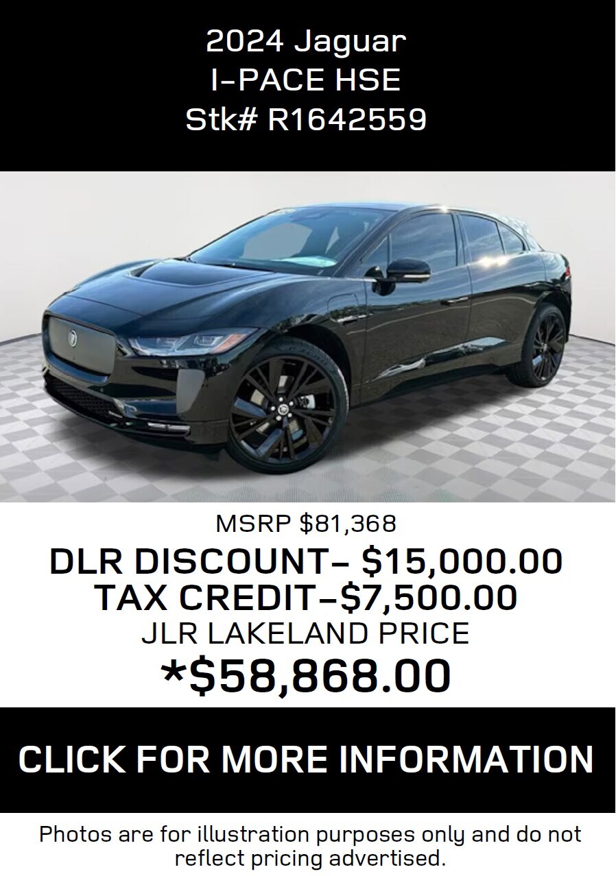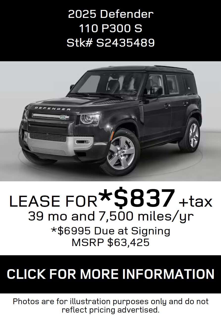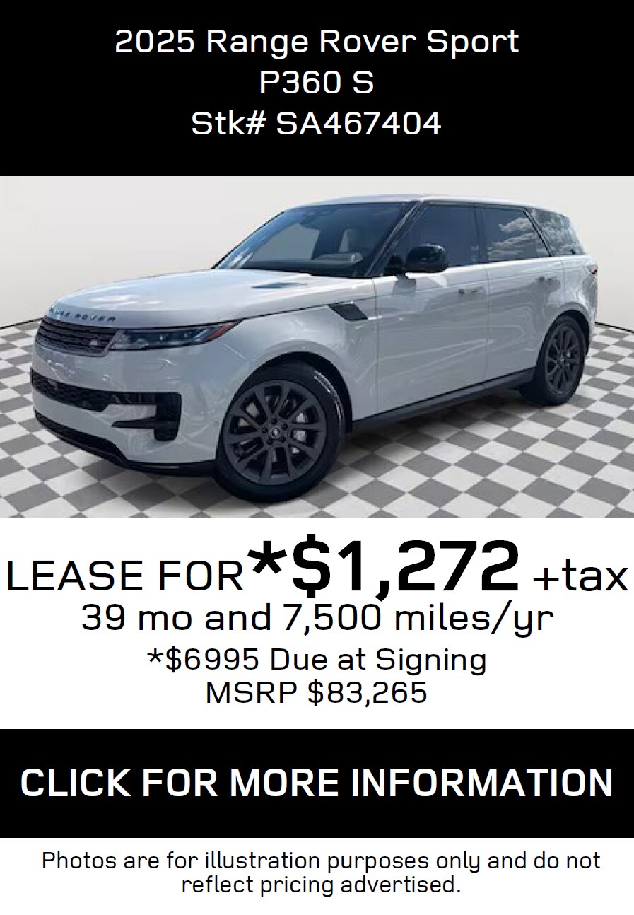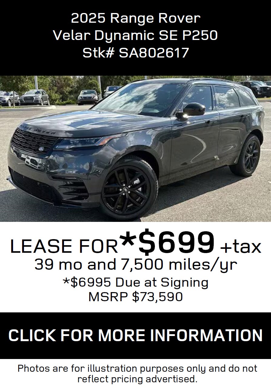 *All Lease and Finance offers are subject to credit approval through Dealer preferred lenders at top tier credit offerings published to Dealer, not all buyers will qualify. All Lease, Finance and Retail price offerings are subject to change without notice and while supplies last. Must take physical delivery by 5-1-2025 close of business. Visit JLR Lakeland for complete details or call toll free (866)-675-5109.Dealer not responsible for misprints, omissionsor typographical errors. Contact Land Rover Lakeland for most current information