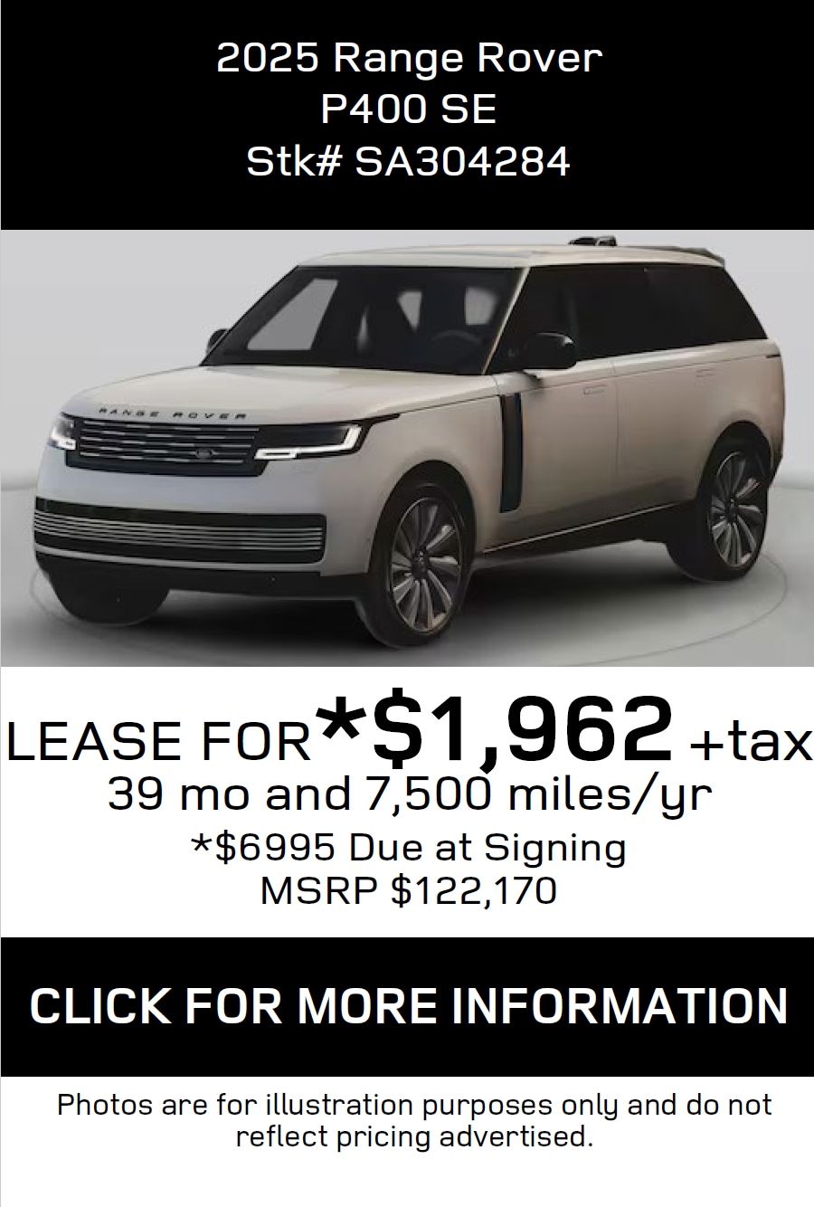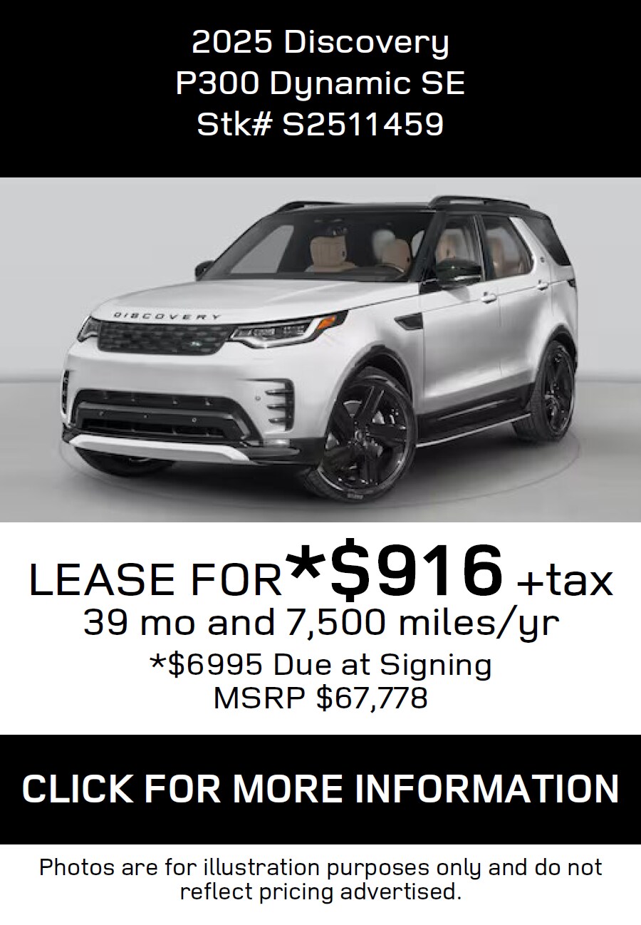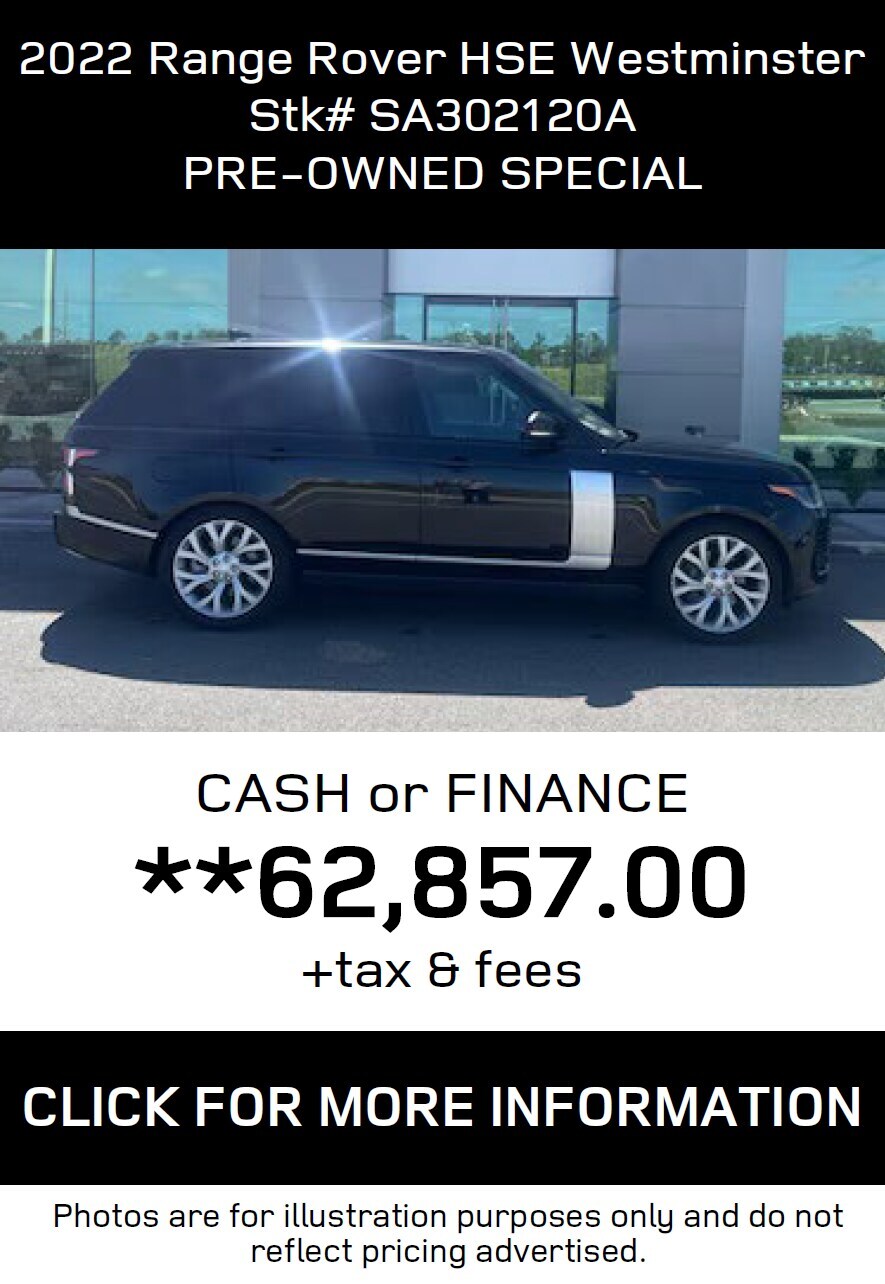 *All Lease and Finance offers are subject to credit approval through Dealer preferred lenders at top tier credit offerings published to Dealer, not all buyers will qualify. All Lease, Finance and Retail price offerings are subject to change without notice and while supplies last. Must take physical delivery by 5-1-2025 close of business. Visit JLR Lakeland for complete details or call toll free (866)-675-5109.Dealer not responsible for misprints, omissionsor typographical errors. Contact Land Rover Lakeland for most current information